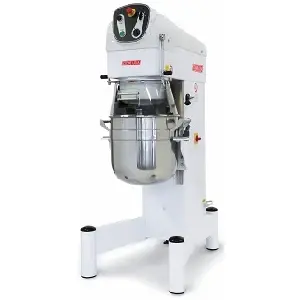 Миксер планетарный напольный с электромеханической панелью управления с 3 скоростями и таймером, с ручным подъёмом дежи, имеет все движущиеся части из никель-хромомолибденовой стали.