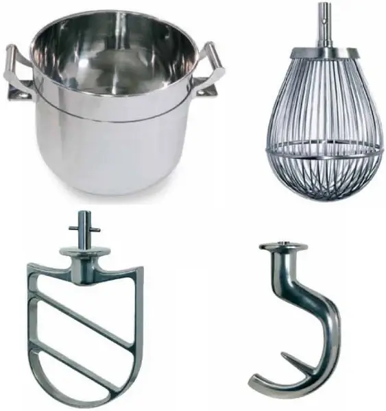 Миксер комплектуется съёмной дежой, изготовленной из нержавеющей стали, тонкопроволочным венчиком, крюком (не спиральный) и битером.