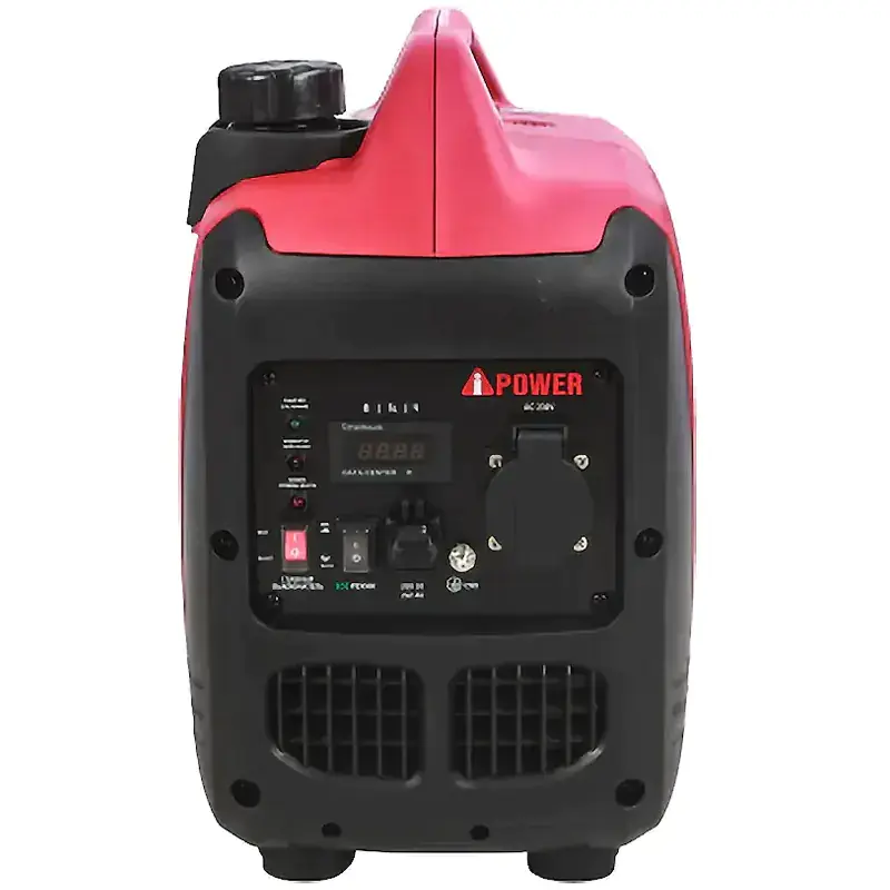 На цифровом дисплее бензогенератора A-iPower A1400IS отображаются текущие напряжение, частота тока, а также количество моточасов. Рядом размещены сервисные индикаторы с соответствующими надписями. Красные лампочки загораются при перегрузке или низком уровне масла в бачке, а зеленая горит при стабильном рабочем состоянии генератора.