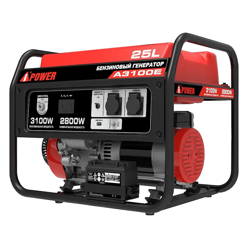 Бензиновый генератор A-iPower A3100E оснащен электрическим стартером и аккумуляторной батарей. Служит автономным источником однофазного тока для электрических приборов, суммарная потребляемая мощность которых составляет 2,8 кВт. Рассчитан на длительную работу без дозаправки благодаря топливному баку объемом 25 литров. Устройство работает на экономичном четырехтактном бензиновом двигателе мощностью 7 л.с. Допускается эксплуатация при температуре воздуха от -20°С до +40°С.