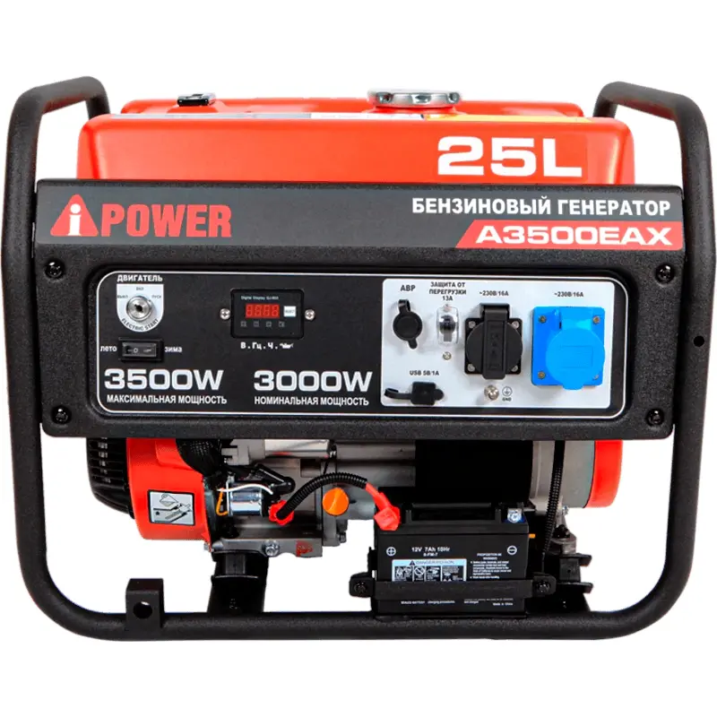 Бензиновый генератор A-iPower A3500EAX оснащен электростартером и разъемом для подключения блока автоматического ввода резерва — АВР. Отличительная черта этой модели — способность выдерживать кратковременную индуктивную нагрузку в 7 кВА, что позволяет подключать потребителей с высоким пусковым током. Устройство служит автономным источником однофазного тока для различного электрооборудования, в совокупности потребляющего 3 кВт. Благодаря большому топливному баку на 25 л электрогенератор работает без дозаправки в течение 14 часов при 100%-ной нагрузке.