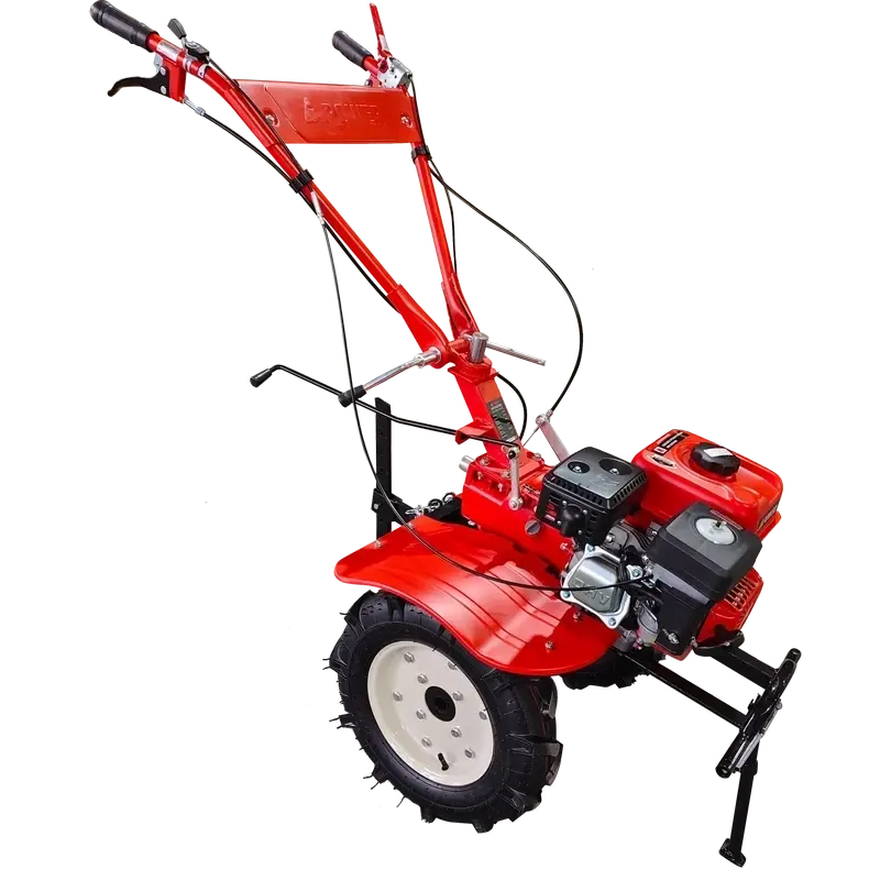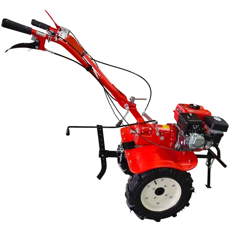 Мотоблок оснащен двумя большими пневматическими колесами с глубокими протекторами, обеспечивающими отличную сцепку с землей. Техника отличается широкой функциональностью и оснащена креплением для навесного оборудования, выполняющего покос травы, возделывание почвы, уборку снега и др.