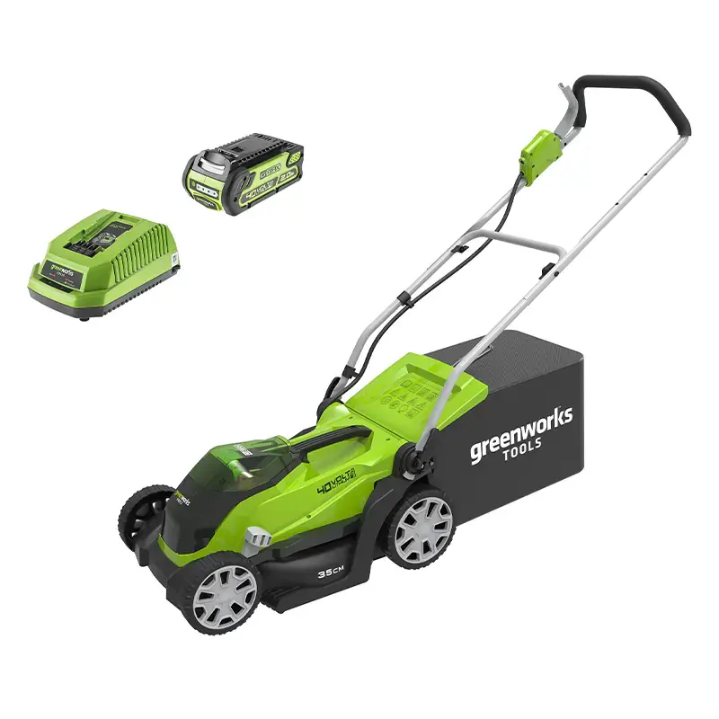 В комплекте с аккумуляторной газонной косилкой Greenworks G40LM35K4 идет зарядное устройство, которое работает со всеми литий-ионными батареями серии G-MAX 40V. Оно оснащено индикатором уровня заряда и автоматически отключается при полной зарядке аккумулятора.