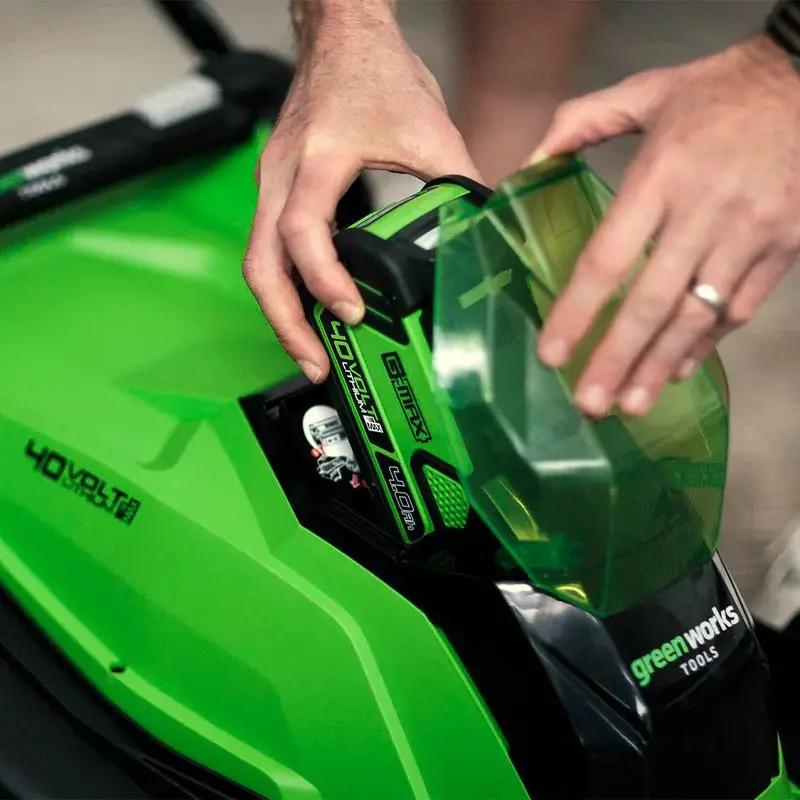 Благодаря тому, что питание косилки происходит от аккумулятора, ее вес меньше по сравнению с аналогами на бензиновых двигателях. Отсутствует вредный для вашего здоровья фактор выхлопов, уменьшен уровень шума и вибрации. Машина не требует дополнительного технического обслуживания, так как производитель снабдил модель достаточным количеством смазки внутренних движущихся деталей. Газонокосилка Greenworks G40LM41 оборудована корпусом из специального «мягкого» пластика, который не потрескается при попадании в него мелких камешков в процессе эксплуатации. Двигатель и лезвия защищены от механических повреждений специальной системой на случай попадания твердых объектов. Рукоятка складывается для удобства при транспортировке и хранении.