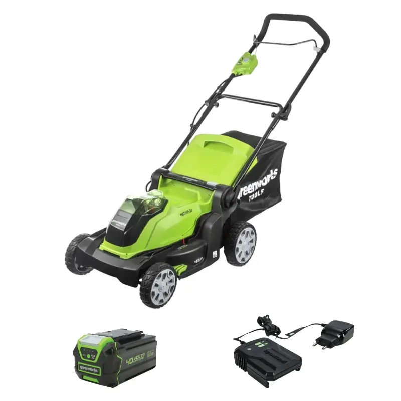 Благодаря тому, что питание косилки происходит от аккумулятора, ее вес меньше по сравнению с аналогами на бензиновых двигателях. Отсутствует вредный для вашего здоровья фактор выхлопов, уменьшен уровень шума и вибрации. Машина не требует дополнительного технического обслуживания, так как производитель снабдил модель достаточным количеством смазки внутренних движущихся деталей. Газонокосилка Greenworks G40LM41 оборудована корпусом из специального «мягкого» пластика, который не потрескается при попадании в него мелких камешков в процессе эксплуатации. Двигатель и лезвия защищены от механических повреждений специальной системой на случай попадания твердых объектов. Рукоятка складывается для удобства при транспортировке и хранении.