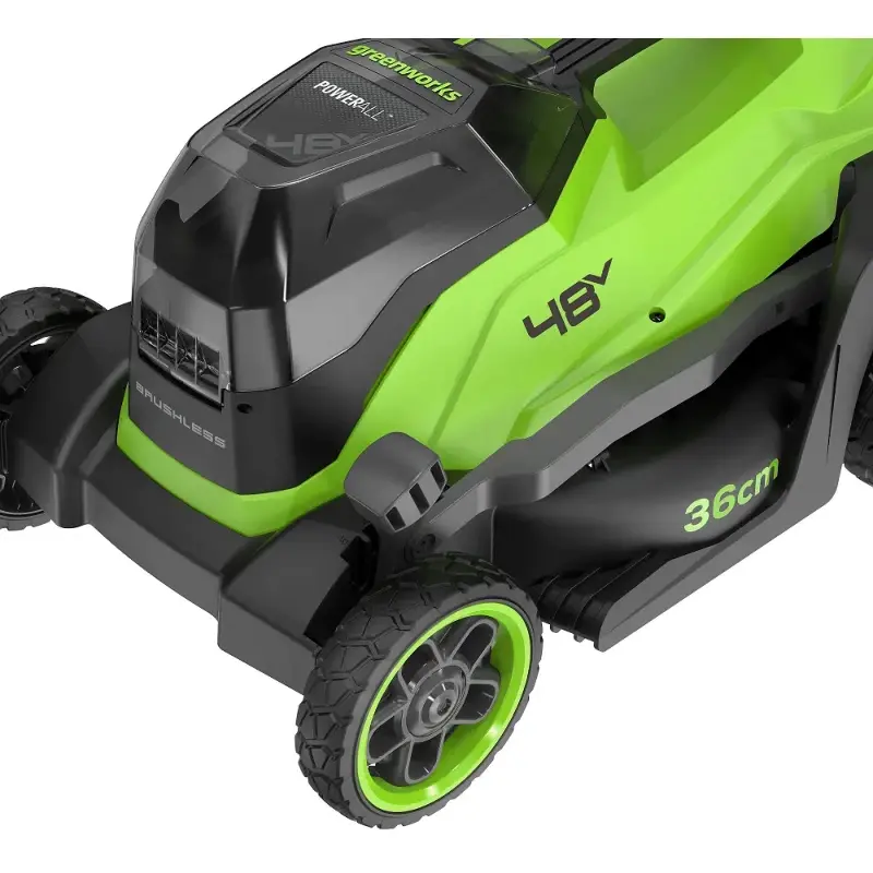 Складная ручка экономит место при хранении и транспортировке. Большие колеса — 15 см передние, 18 см задние — легко преодолевают неровности. Универсальную рукоятку с двумя равноправными рычагами управления можно удерживать как правой, так и левой рукой. Газонокосилка Greenworks GD24X2LM361 экологична и экономична в эксплуатации — никаких вредных выбросов, шума и лишних затрат на топливо – только чистый газон без хлопот. Для работы подойдут аккумуляторы от любых инструментов из линейки Greenworks 24V.