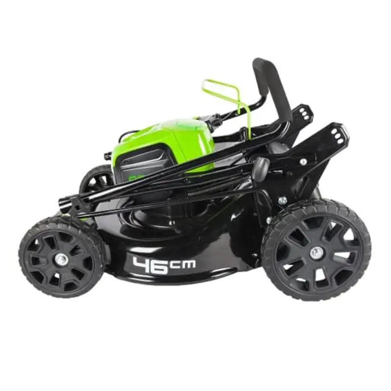 - Газонокосилка имеет ширину скашивания 46 см, обладает функцией мульчирования, сбора травы в травосборник, а также боковой выброс травы.