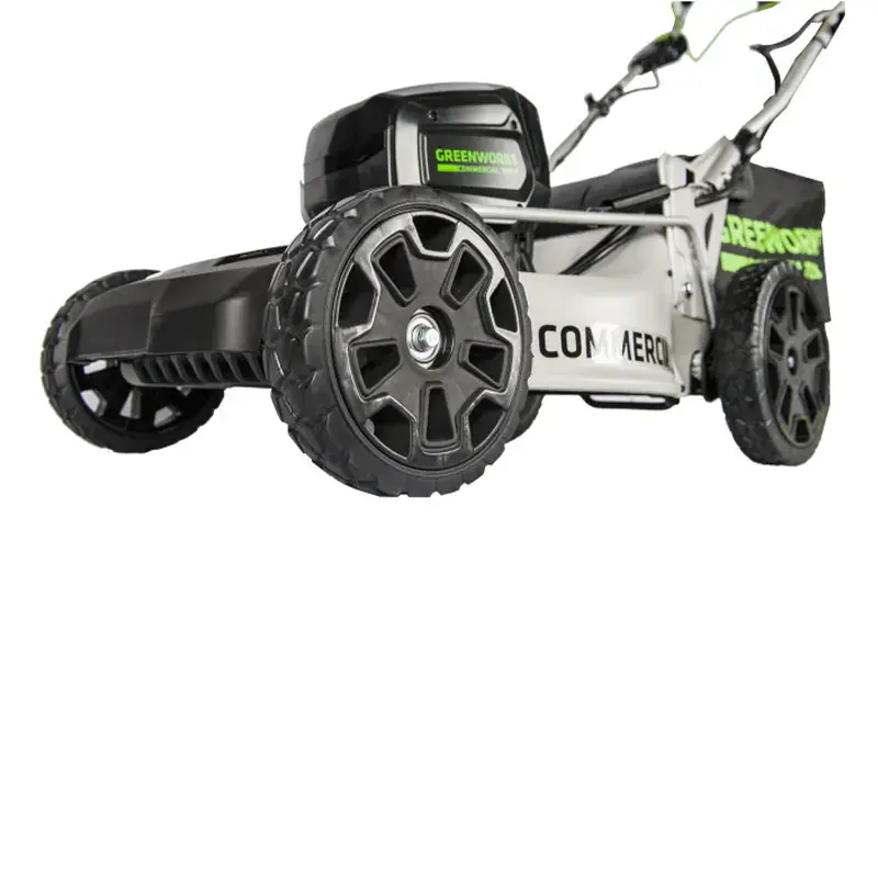 Greenworks Pro 82V - это самая мощная аккумуляторная газонокосилка самоходная. Привод на задние колеса помогает в стрижке газона, косилку не нужно толкать - она едет сама и имеет 2 скорости.