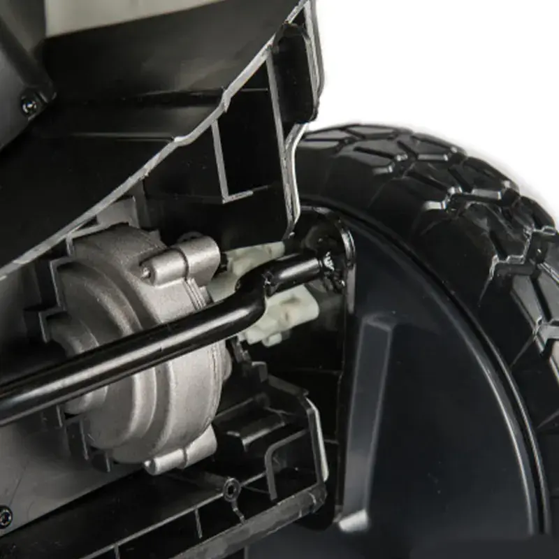 - Дека аккумуляторной газонокосилки выполнена из стали, а корпус двигателя из АБС пластика защищен специальной дугой, которая в то же время является ручкой для переноски газонокосилки.
