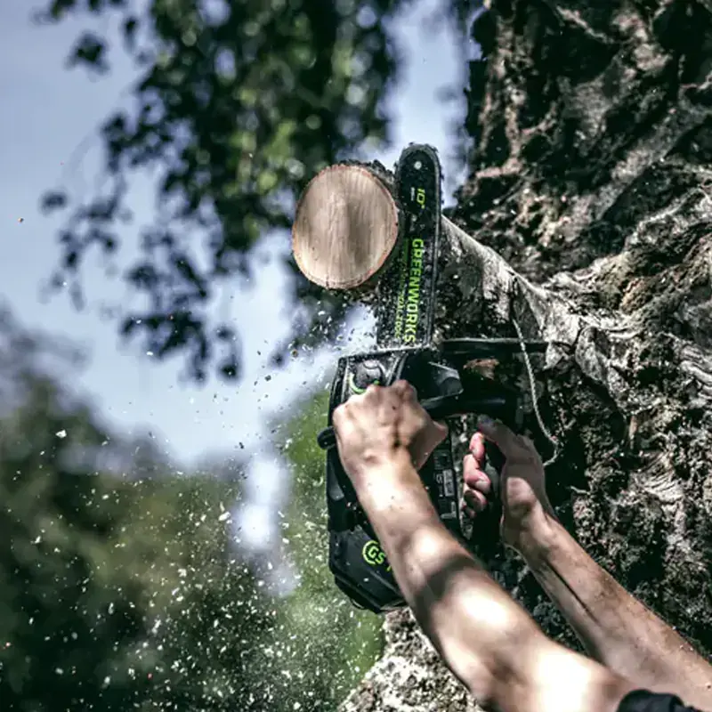 В отличие от сетевых моделей, с одноручной бесщеточной цепной пилой GreenWorks GD40TCS не придется путаться в электрическом проводе. При этом ваше перемещение не будет ограничено длиной кабеля, а отсутствие розетки на участке не помешает работе. В сравнении с бензиновыми пилами, модель более экологична т.к. не выделяет вредных выхлопных газов.