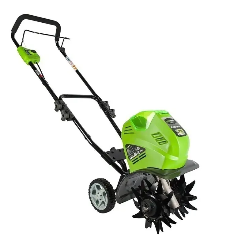 Электрический культиватор Greenworks G40TL способен прополоть или вскопать почву на глубину до 12,7 см. Ширина обработки 250 мм позволит качественно и быстро обработать участок. Поставляется с аккумулятором емкостью 4 Ач и зарядным устройством.