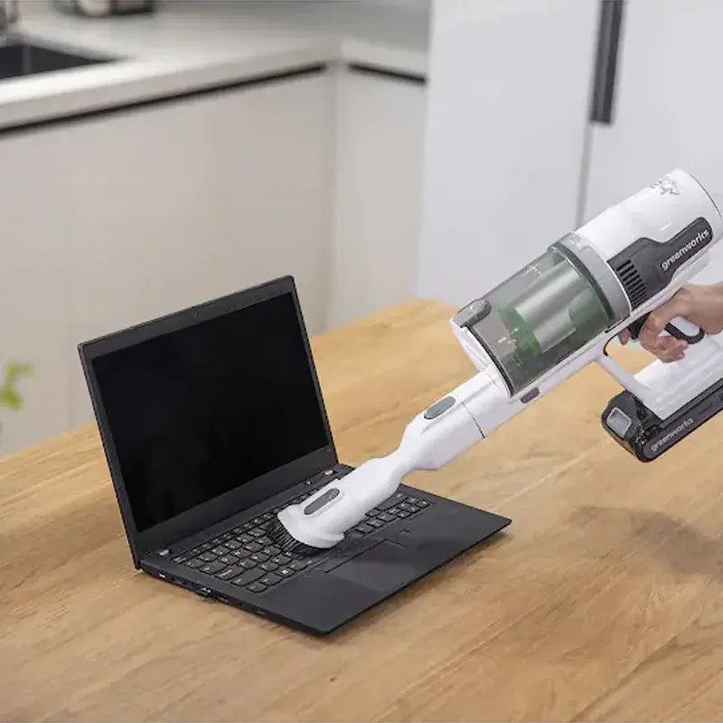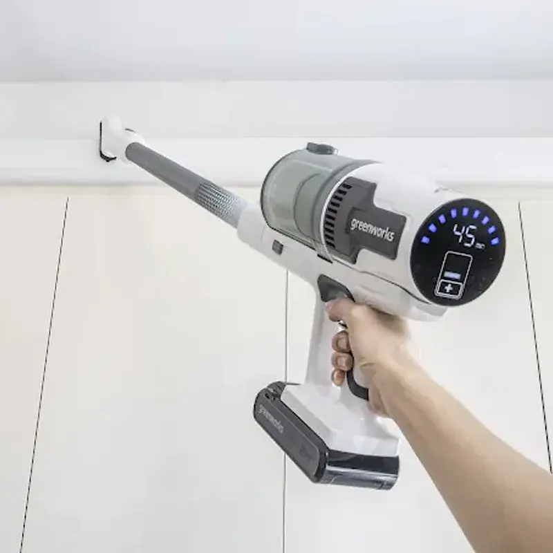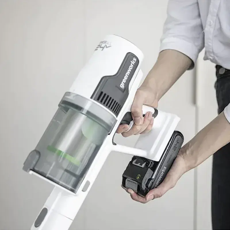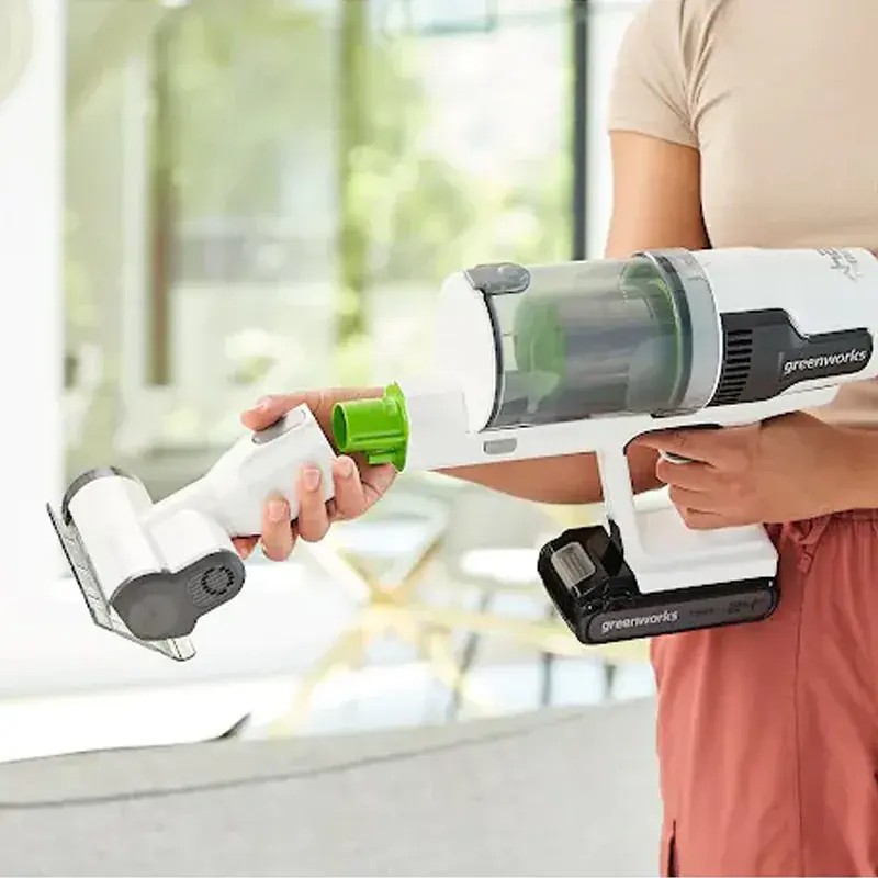 Беспроводной пылесос Greenworks G24SVK4D прост в применении. За счет клипс вы можете крепить насадки к штанге, чтобы они всегда были у вас под рукой и не потерялись. Для тщательной уборки под мебелью или при недостаточном освещении нижняя часть пылесоса оснащена светодиодной подсветкой. Все электрощетки легко разбираются без применения дополнительных инструментов. Это обеспечивает простую очистку насадок после работы.