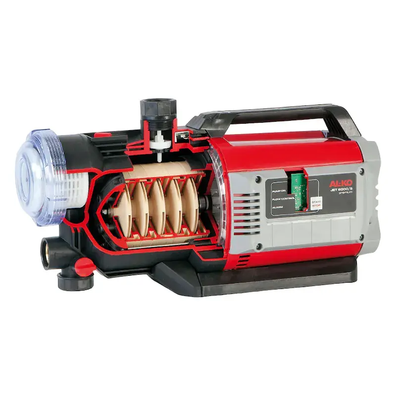 Садовый насос AL-KO Premium JET 6000-5 обладает защитным термореле, которое срабатывает автоматически в случае перегрева. Оно останавливает работу двигателя, чтобы предотвратить преждевременную поломку. Повторный запуск будет возможен через 15-20 мин, когда внутренние элементы охладятся. Электронный блок управления Flow-Control защищает насос от сухого хода.