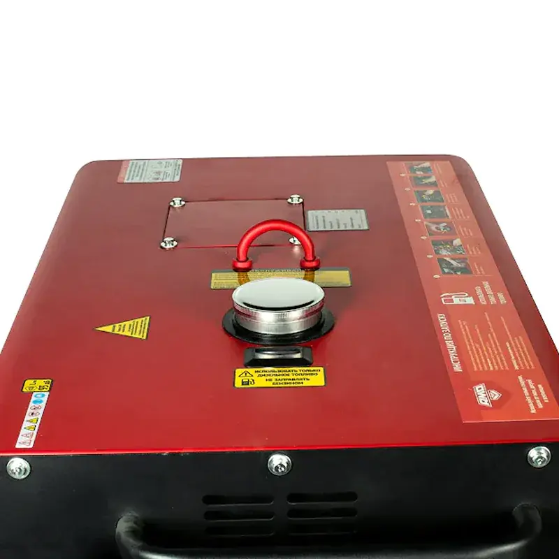 Благодаря электростартеру двигатель быстро запускается поворотом ключа в замке зажигания. Вместительный топливный бак на 14,5 литров обеспечивает продолжительную работу дизельного генератора без дозаправки. Количество топлива удобно отслеживать благодаря индикатору на крышке. На цифровом дисплее отображаются текущие данные о напряжении, частоте тока и количестве моточасов. Индикаторная лампа сигнализирует о низком уровне моторного масла. На панели находятся две розетки переменного тока 230 В на 16/32 А и выход постоянного тока 12 В для подключения потребителей. Разъем АВР позволяет подключить оборудование, которое автоматически запускает генератор при отключении центрального электроснабжения.