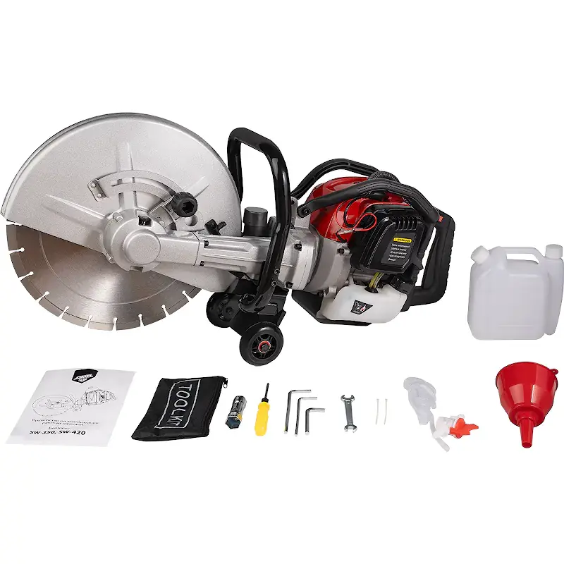 Бензорез AMO SW-350 служит для резки бетона, металла, гранита, асфальта и прочих твердых материалов. Инструмент находит широкое применение во время демонтажных, строительно-ремонтных и спасательных работ. Двухтактный двигатель мощностью 3,7 л.с. обеспечивает скорость вращения пильного диска до 5000 об/мин с максимальным крутящим моментом 3,5 Нм. Бензиновый резчик рассчитан на эксплуатацию при температуре окружающего воздуха от -10 до +40_С.