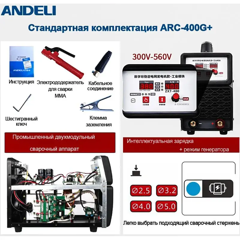 Инверторный сварочный аппарат ANDELI ARC 400 (Z312) предназначен для производственного применения и рассчитан на непрерывную работу в течении продолжительного времени. Аппарат предназначен для ручной дуговой сварки (MMA)