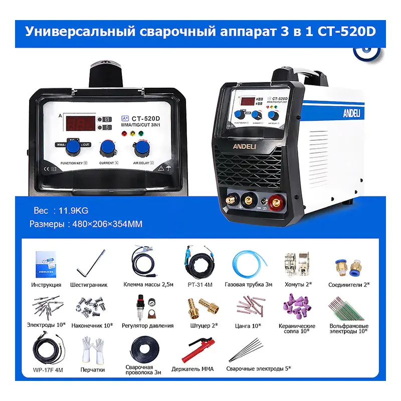 Многофункциональная инверторная установка, находящаяся в линейке промышленного оборудования. Данный сварочный инвертор содержит в себе три режима работы: режим аргонодуговой сварки неплавящимся вольфрамовым электродом (TIG Tungsten Inert Gas), режим ручной дуговой сварки покрытым электродом (MMA Manual Metal Arc) и режим воздушно-плазменной резки (PAC Plasma Arc Cutting).Оборудование серии CT широко применяется при резке и сварке углеродистой, нержавеющей и легированной сталей, а также цветных металлов.