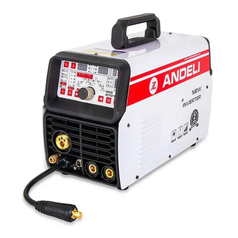 Сварочный полуавтомат Andeli MIG 270TPL поддерживает несколько режимов: MMA, MIG, TIG, а также COLD. Профессиональная модель с регулировкой сварочного тока от 10 до 200 А способна выполнять короткие и длинные швы, а также позволяет работать с использованием порошковой проволоки без использования газа.