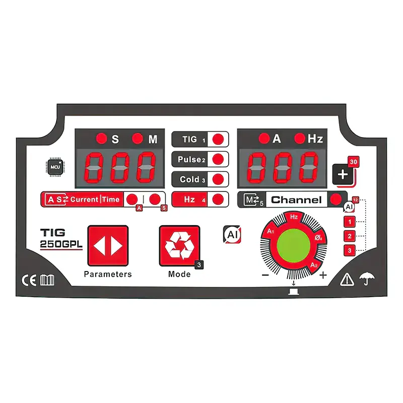 На панели управления инверторного сварочного аппарата ANDELI TIG-250GPL расположено два дисплея, которые позволяют отслеживать заданные параметры работы. Рядом расположены кнопки управления с соответствующими надписями и обозначениями. Все элементы защищены прозрачной пластиковой крышкой. Она бережет кнопки от попадания пыли и грязи, а также исключает их случайное нажатие во время работы.