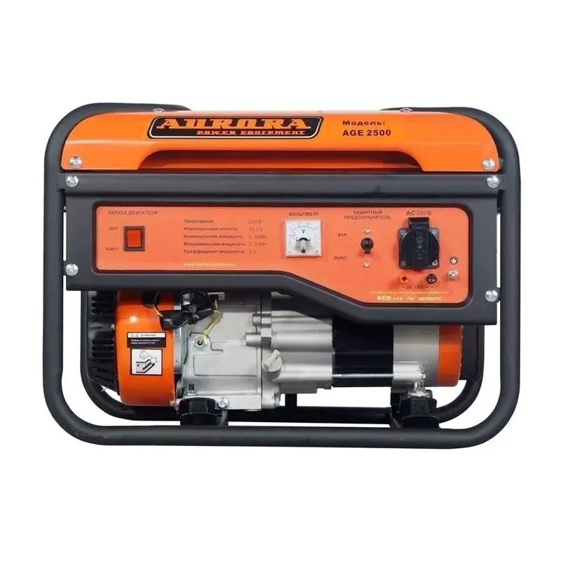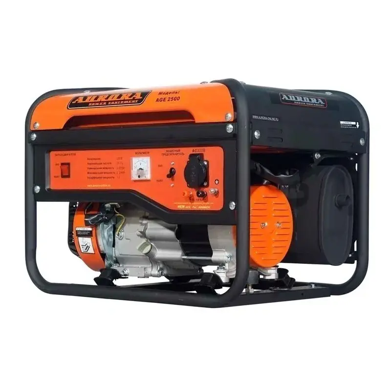Бензиновый генератор Aurora AGE 2500 с максимальной выходной мощностью 2,2 кВт оборудован розеткой с выходом 220 В для питания однофазных потребителей. Мотор заводится с помощью ручного стартера с облегченной системой запуска.