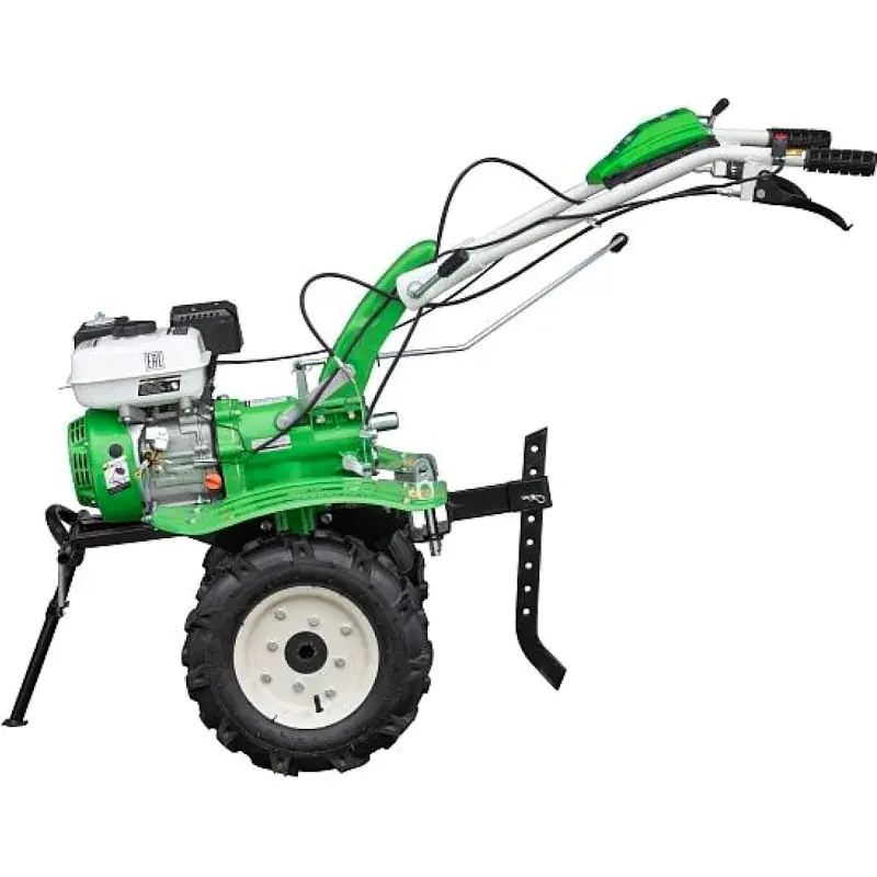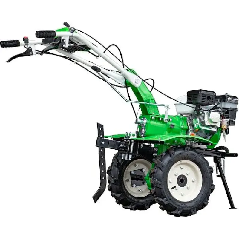 На шестигранные оси диаметром 23 мм можно установить колеса с глубоким протектором, фрезы или грунтозацепы. С помощью соответствующего навесного оборудования бензиновый мотоблок вспашет землю, сформирует грядки, окучит или выкопает картофель и другие корнеплоды, скосит траву, поможет перевезти грузы.