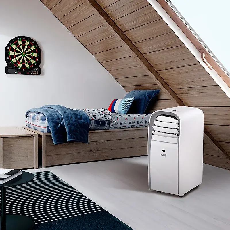 Мобильный кондиционер с номинальной мощностью охлаждения 2,05 кВт или 7000 BTU работает в четырех режимах: кондиционирование, вентиляция, осушение и Smart. Максимальная производительность трехскоростного вентилятора достигает 330 м3/ч.
