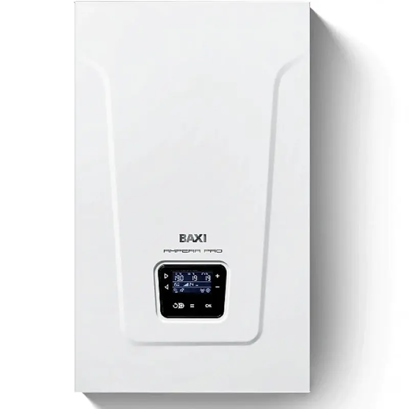 Электрический котел Baxi Ampera Pro 30 с одним контуром и ступенчатым переключением мощности служит для отопления помещений и, в случае подключения бойлера, для горячего водоснабжения. Встроенный термостат с часами реального времени работает согласно запрограммированным режимам. Датчик температуры окружающего воздуха обеспечивает автоматическую регулировку степени нагрева в зависимости от изменения погодных условий. Аппарат работает от трехфазной сети и поддерживает девять ступеней тепловой мощности: 3, 6, 9, 12, 15, 18, 22, 26 и 30 кВт. Объем теплоносителя в контуре циркуляции составляет 12 л.
