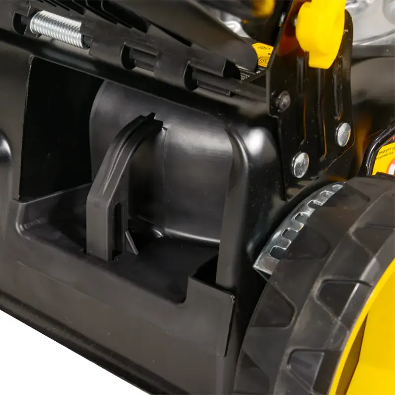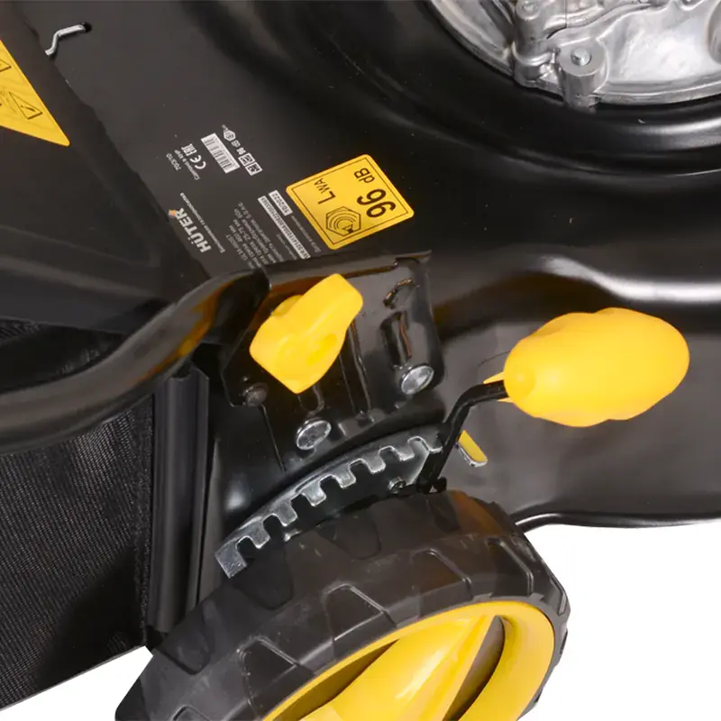 Высота стрижки бензиновой газонной косилки настраивается при помощи рычажка, который расположен у заднего колеса. Диапазон регулировки составляет от 25 до 75 см. Благодаря этому можно подобрать оптимальный параметр как для стрижки кончиков травы, так и для реза под корень на заросшем участке.