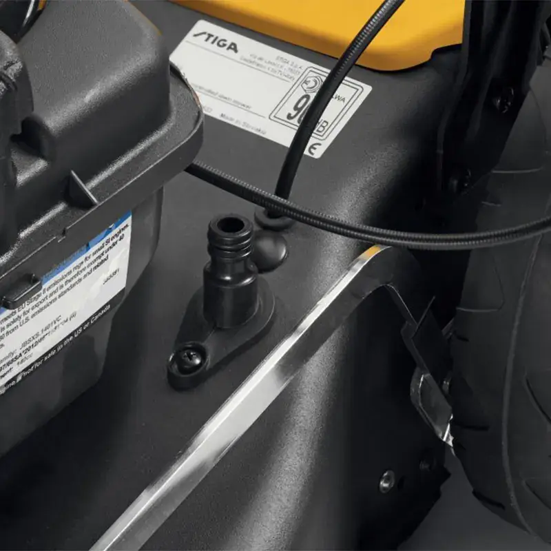 Режущая дека 46 см. с порошковым покрытием. Оборудована двигателем собственного производства компании Stiga ST 170 LS OHV Autochoke с удобной кнопкой запуска от электрического стартера от литиевого аккумулятора, объемом 166 куб.см. с автоматической воздушной заслонкой, мощностью 2,6 кВт./3,5 л.с., при 2900 об/мин., 60-литровым травосборником из текстиля и пластика с индикатором заполнения и специальным быстродействующим креплением, не допускающим просыпания собранной травы при отсоединении контейнера
