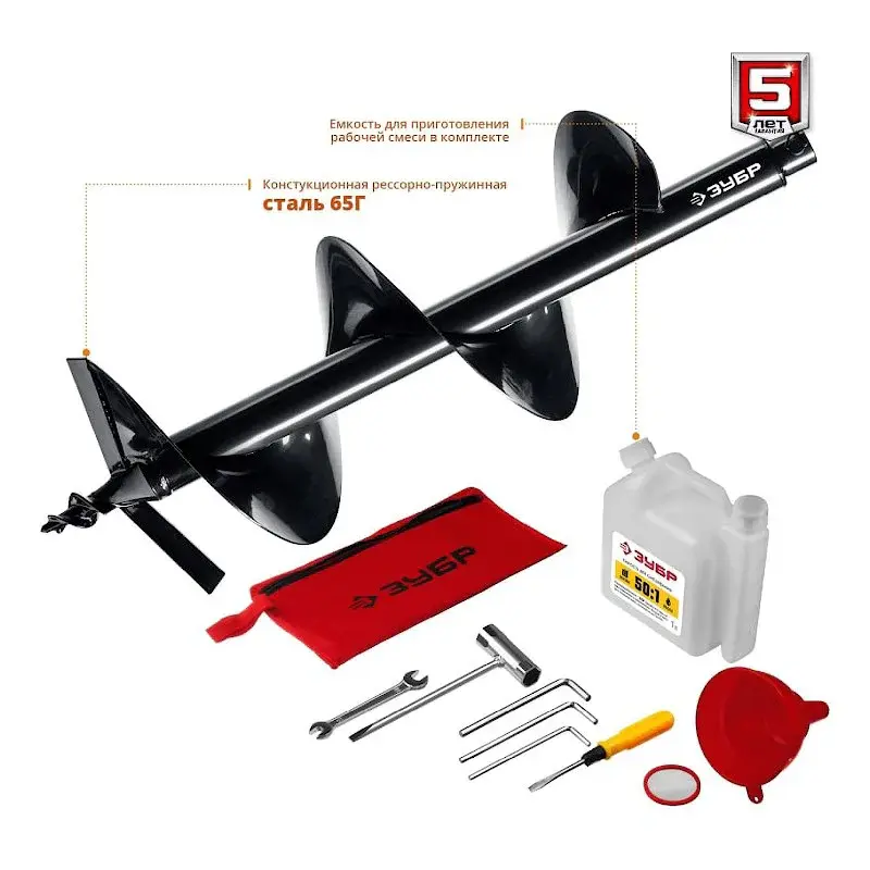 Мотобур Зубр МБ2-300 Н используется для сверления скважин во льду и в земле. Устройство оснащено 2-тактным двигателем мощностью 3,26 л.с, который подходит для продолжительных работ. В комплекте поставляется шнек длиной 80 см.