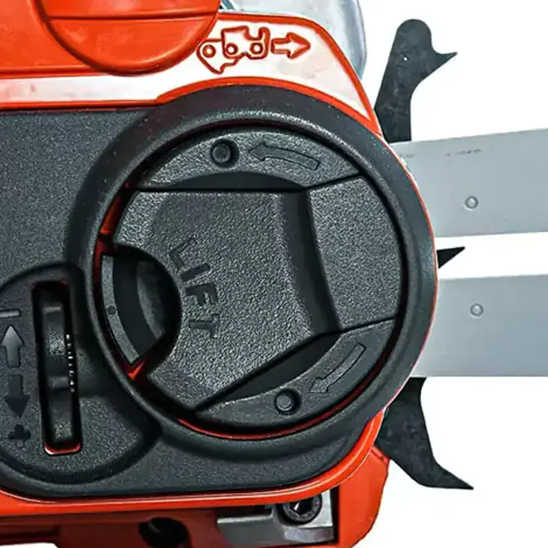 - Бесключевой натяжитель позволяет регулировать цепь без использования инструментов, вам достаточно откинуть крышку и прокрутить рукоятку.