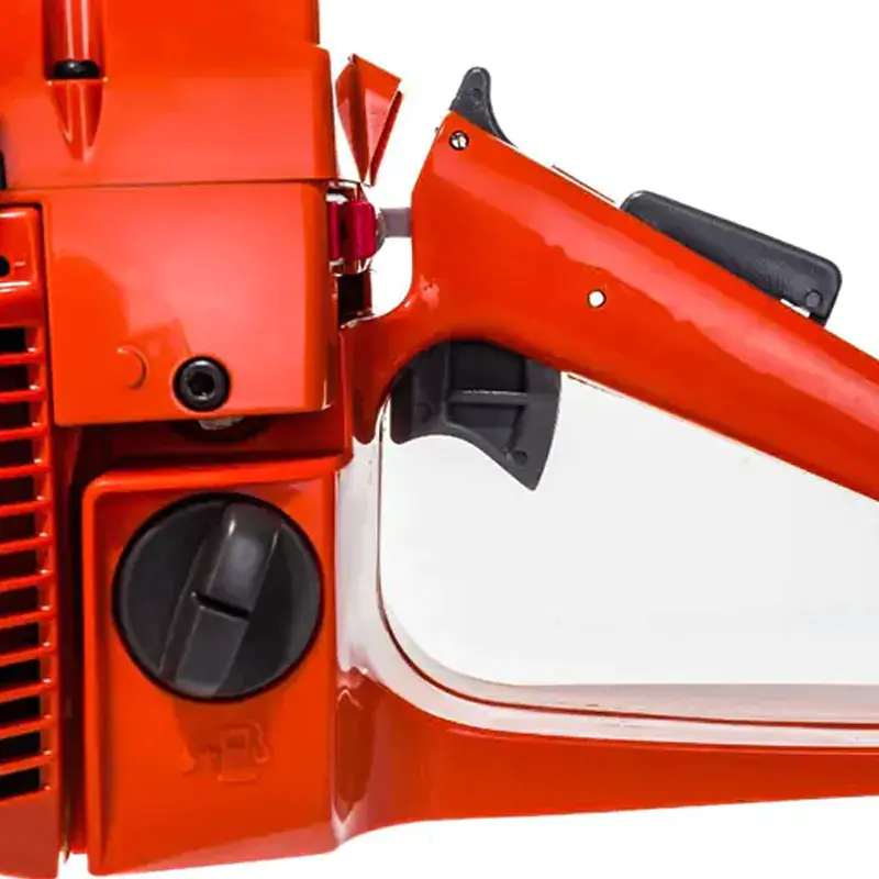 Передняя рукоятка расположена под углом к корпусу, задняя – строго вертикально. Эргономичное расположение исключает перенапряжение кистей и обеспечивает надежный захват инструмента. Система амортизаторов служит для снижения уровня вибраций. Выхлопные газы отводятся в сторону от оператора с помощью глушителя, который также минимизирует уровень шума, создаваемого работающим мотором.