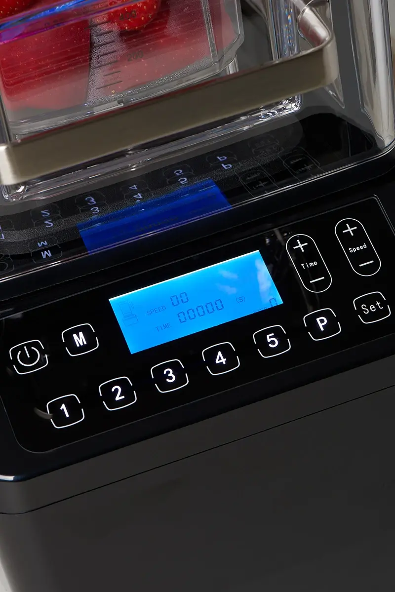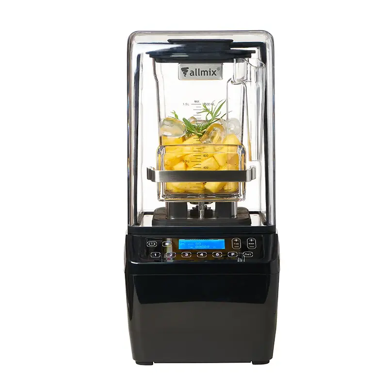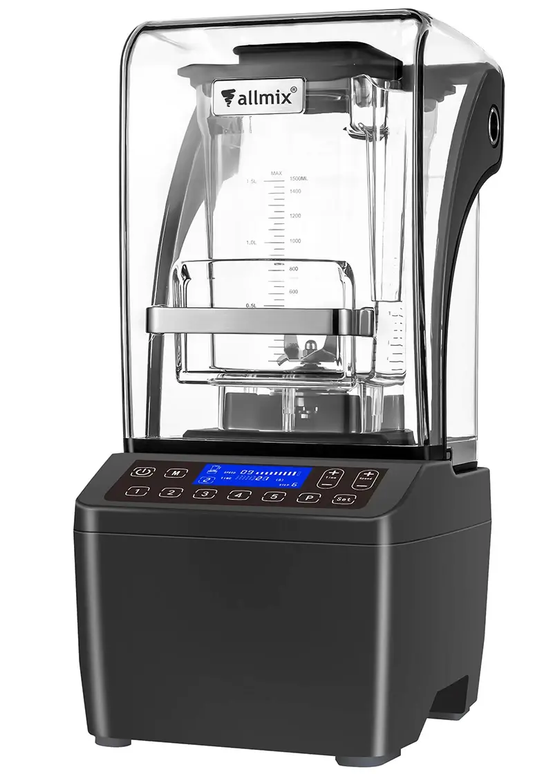 Блендер Allmix AMX-885 мощностью 1500 Вт. со звукоизолирующим кожухом из поликарбоната, тачскрин клавиатурой из минерального стекла с подсветкой, графическим дисплеем, приводом "металл-металл" и возможностью создания собственных программных циклов непосредственно с клавиатуры блендера.
