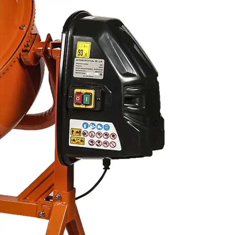 Бетономешалка работает от сети 230 В. Электродвигатель мощностью 950 Вт имеет защиту от перегрева, закрыт пластиковым кожухом от попадания пыли и грязи. Износостойкий зубчатый приводной ремень сглаживает вибрации, обеспечивает плавность работы, включение и выключение без рывков. Скорость барабана составляет 24-29 об/мин.