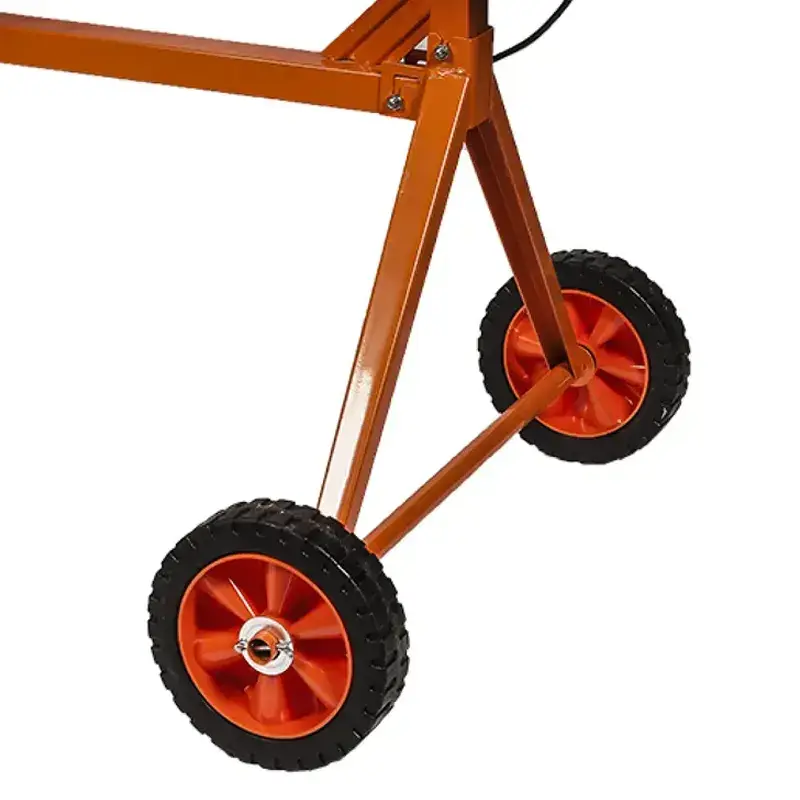 Бетономешалка снабжена парой больших резиновых колес, которые обеспечивают высокую проходимость по стройплощадке. Для устойчивости предусмотрена передняя опора.