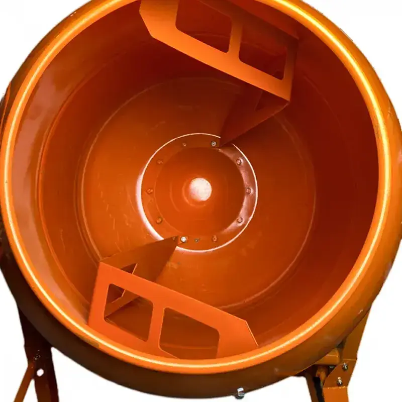 Болтовое крепление лопастей к корпусу предотвращает их обламывание в процессе работы, упрощает очистку и замену при необходимости. Верх корпуса барабана изготовлен из стали толщиной 1,5 мм, толщина стали в нижней части составляет 1,9 мм. Зубчатый венец выполнен из чугуна. Для защиты от коррозии на все металлические детали бетономешалки нанесено порошковое покрытие.
