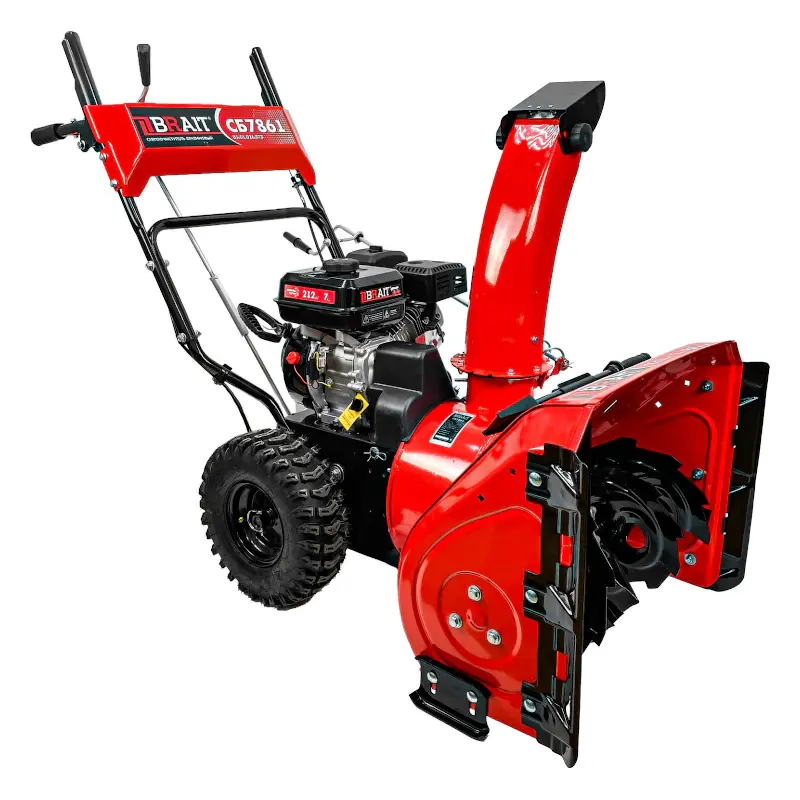 Высоту ковша над землей можно регулировать, поднимая выше или ниже в зависимости от состояния очищаемой поверхности. Двусторонние опорные лыжи, выполненные из прочного металла, прослужат долгие годы. Каждое колесо имеет шплинт разблокировки межколесного дифференциала, которым можно воспользоваться для повышения маневренности машины при разворачивании или заезде в гараж. На корпусе снегоуборщика BRAIT СБ-7861 прикреплен инструмент для устранения наледи и засоров в дефлекторе желоба.