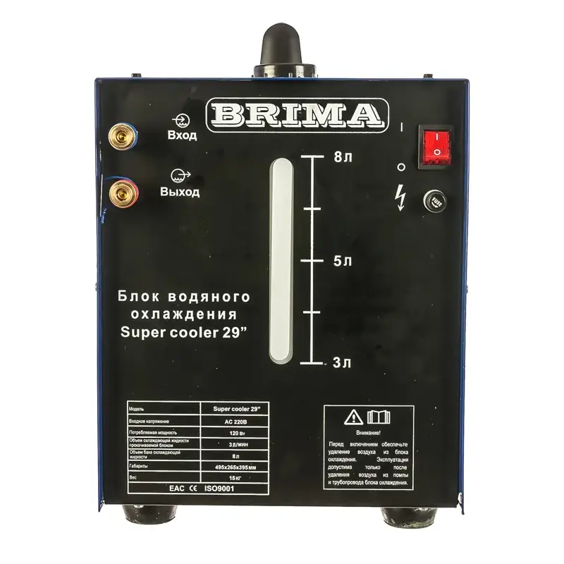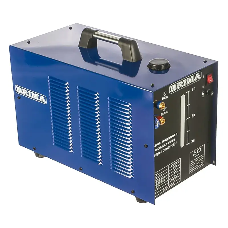 Блок водяного охлаждения BRIMA Super Cooler-29 Блок водоохлаждения автономный предназначен для обеспечения охлаждения и циркуляции рабочей жидкости в замкнутой системе, при работе с установками аргоно-дуговой сварки и воздушно плазменной резки.