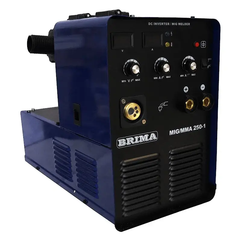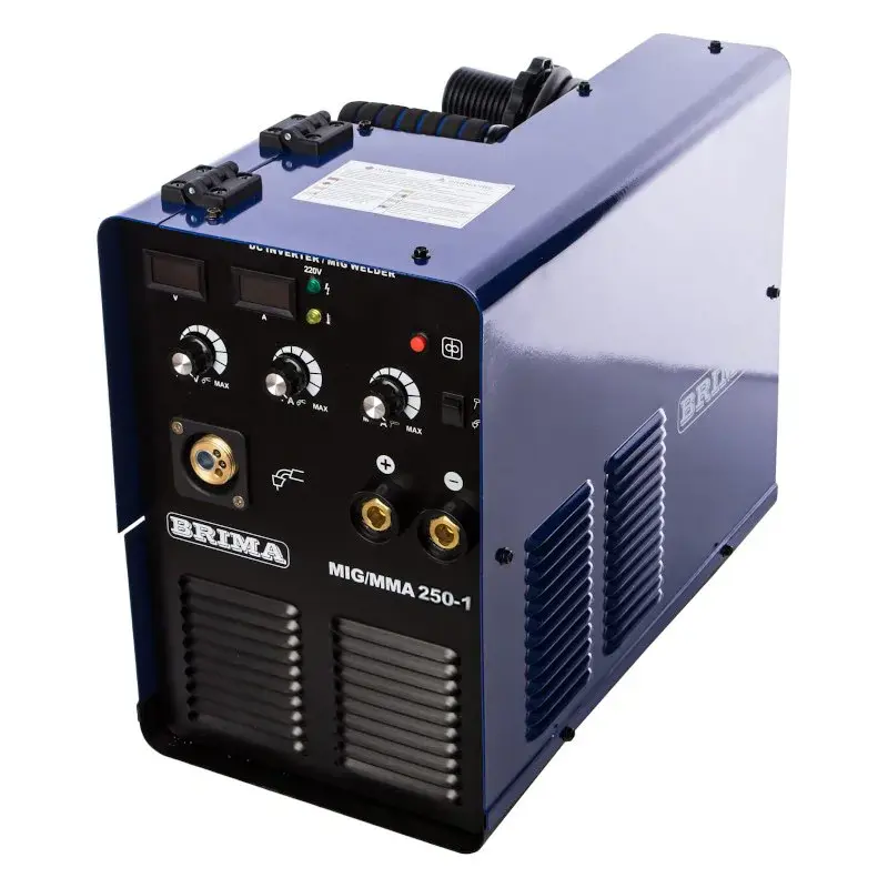 Сварочный полуавтомат BRIMA MIG/MMA-250-1 – промышленный аппарат для работы в режимах MMA и MIG. Максимальный сварочный ток составляет 250 А. Для использования модели подойдет проволока диаметром 0,8 - 1 мм или электрод от 1,6 до 6 мм.