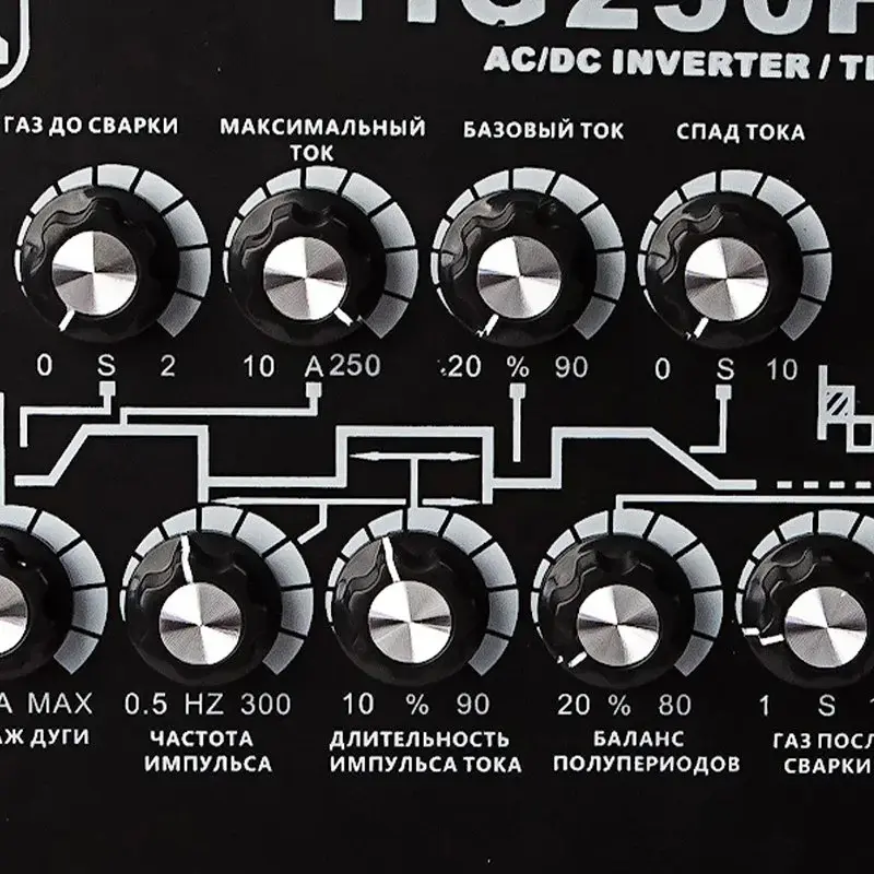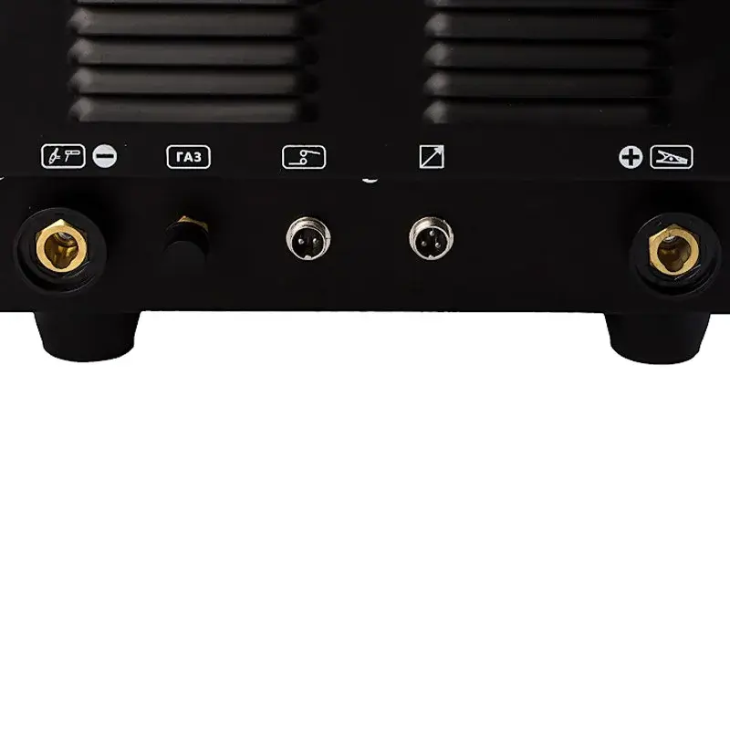 - Подключение кабелей. Специальные силовые разъемы инверторной установки BRIMA TIG-250Р AC/DC служат для быстрого подключения сварочного кабеля.
