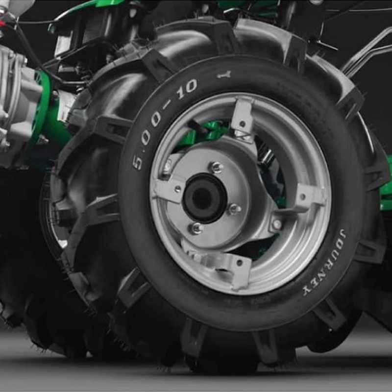 Большие пневматические колеса с сельскохозяйственным протектором обеспечивает высокий уровень сцепления на грунте и проходимость, возможность эффективно работать любым навесным оборудованием