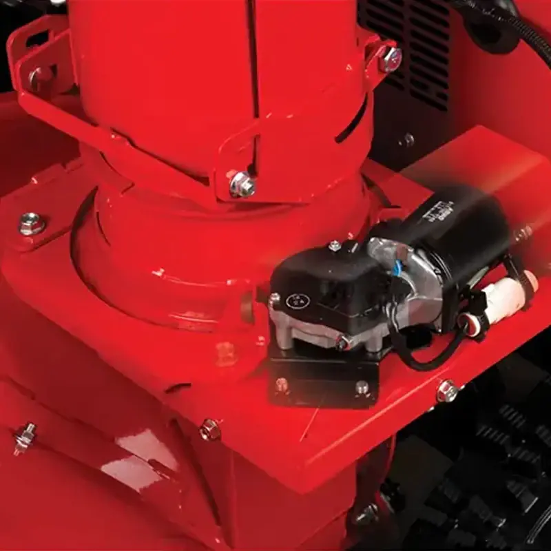 Электромотор (сервопривод) позволяет регулировать угол и положение дефлектора выброса снега при помощи джойстика на панели оператора.