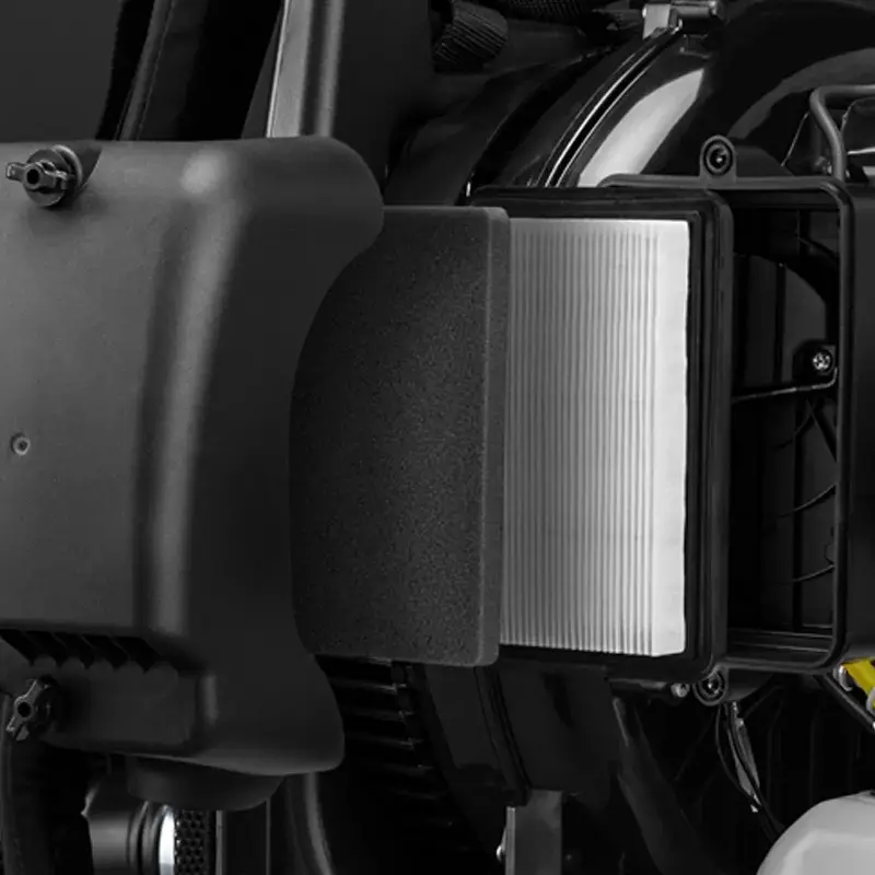 - Воздушный фильтр автомобильного типа. Гофрированный фильтр имеет большую площадь поверхности, благодаря чему он служит дольше и надежно защищает мотор от попадания посторонних частиц, особенно при работе в пыльных условиях.