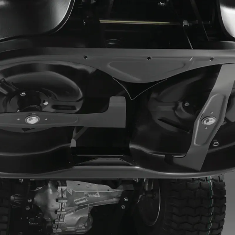 Двухножевая режущая дека с «крылатыми» ножами и штуцером для подсоединения шланга S-образные ножи в сочетании со специальной формой режущей деки способствуют формированию мощного воздушного потока. Это позволяет эффективно скашивать высокую и мокрую траву и забрасывать ее в травосборник, максимально полно используя его объем. Кроме того, это обеспечивает качественный результат в режиме мульчирования. Фитинг позволяет подсоединить садовый шланг и промыть деку изнутри. Дека шириной 97 см установлена под углом 17°, что обеспечивает равномерное окашивание, в том числе при маневрировании.