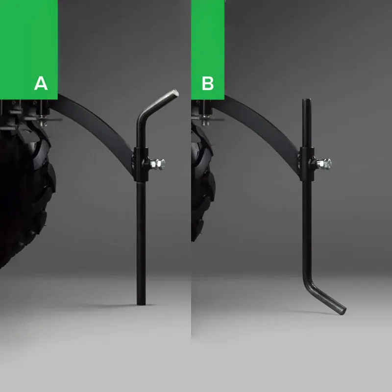 Высота руля легко регулируется в соответствии с индивидуальными предпочтениями. Рукоятку можно отвести в сторону и зафиксировать. Это положение позволяет идти рядом с мотоблоком Caiman Vario 70C, чтобы не топтать вспаханную землю. Транспортировочное колесо обеспечивает удобство перемещения к месту вспашки и стоянки.