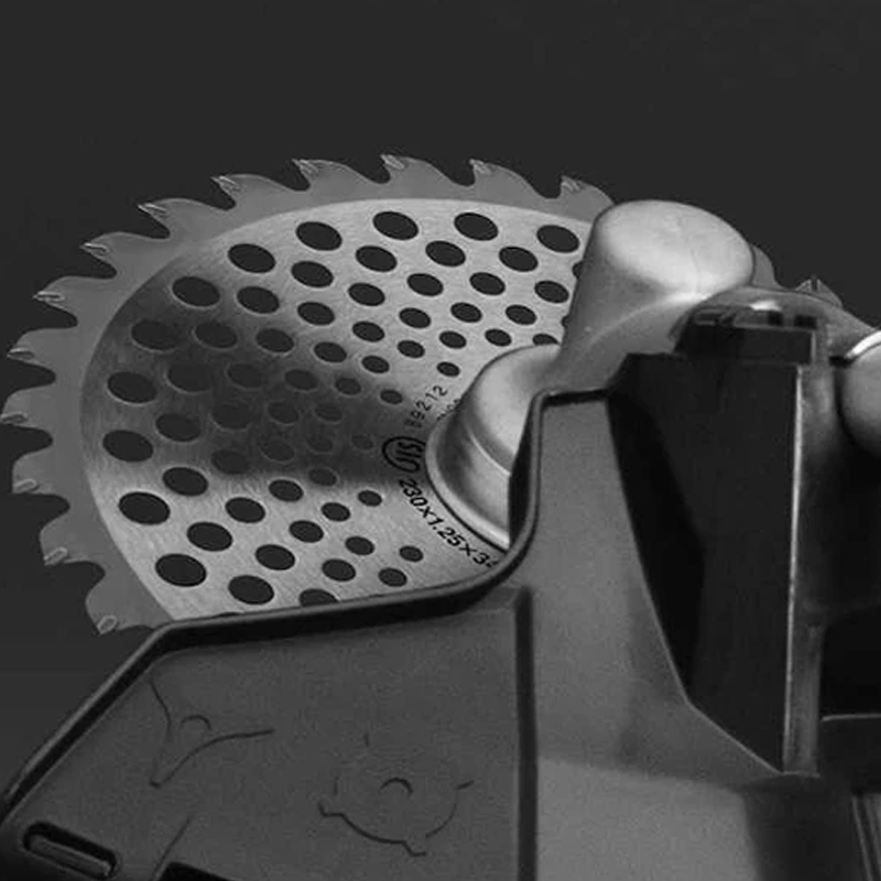 В стандартной комплектации имеется комбинированный защитный кожух со съемным элементом, который подходит как для работы с триммерной насадкой, так и со стальным диском. Для работы со стальным диском необходимо отсоединить нижнюю съемную часть кожуха.