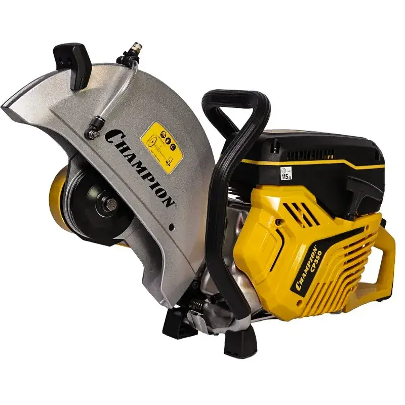 Бензорез CHAMPION CP350 используется с диском диаметром до 350 мм, обеспечивая максимальную глубину реза материала 125 мм. В комплект входят ключи, емкость для приготовления топлива, отвертка и ремень.