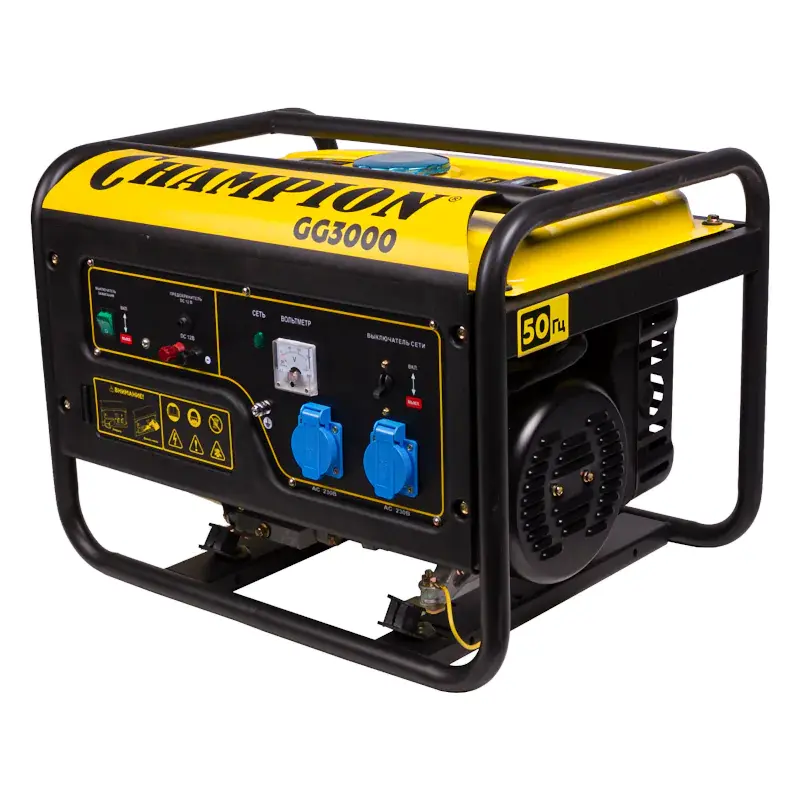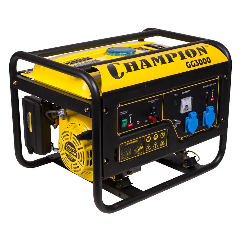 Бензиновый генератор CHAMPION GG3000 – компактная мобильная электростанция, обеспечивающая работу электроприборов в любых условиях. Устройство подходит для использования на дачах, в путешествиях, на торговых и других площадках, где нет доступа к обычной электросети. Модель оснащена двумя розетками для подключения потребителей мощностью до 2,3 кВт.