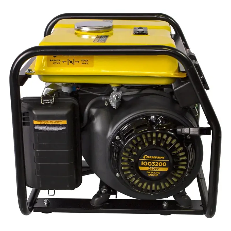 Бензобак объемом 5,7 л имеет удобную для заправки широкую горловину. Ручной стартер надежен и прост в эксплуатации. Для запуска двигателя достаточно легким движением руки вытащить трос. Воздушный и топливный фильтры продлевают срок службы генератора CHAMPION IGG3200. Простой доступ к свече зажигания и фильтрам позволяет самостоятельно производить техническое обслуживание.