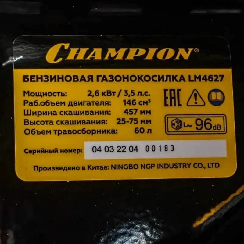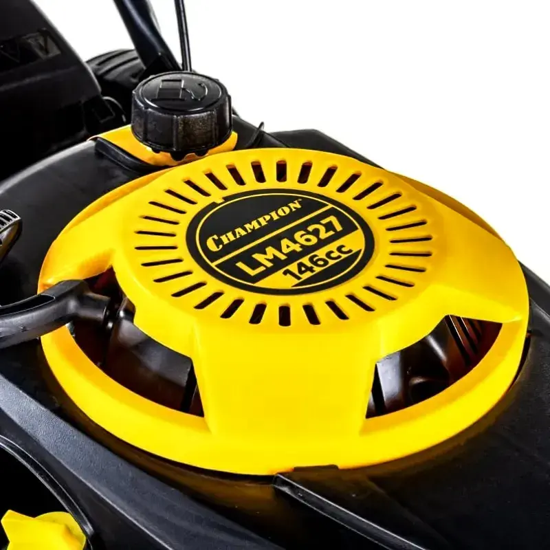 Мягкая накладка на рукоятке снижает вибрацию на руки. Высоту кошения можно регулировать одновременно для всех колес путем переключения одного рычага. Особая конструкция стальной деки газонокосилки CHAMPION LM4627 позволяет косить траву вплотную к стене или забору.